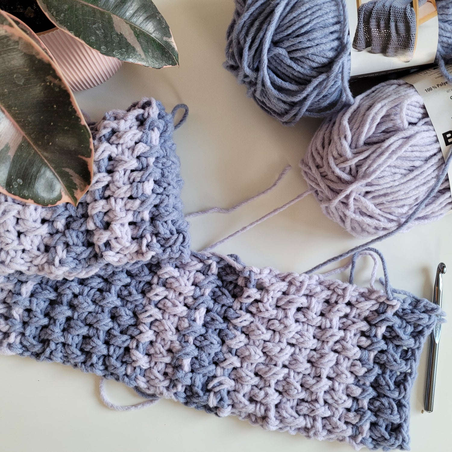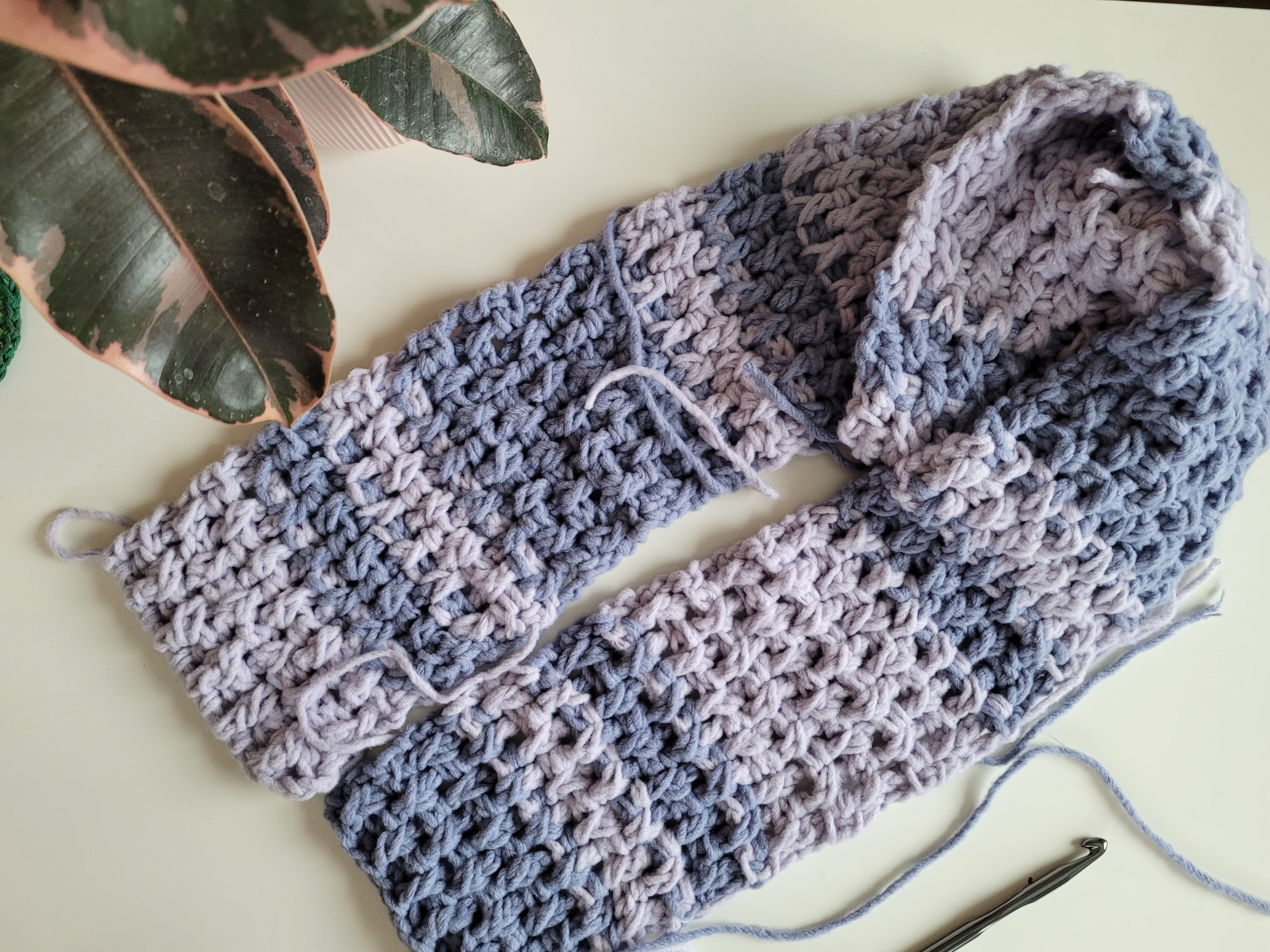 Then to finish off the crochet scarf I completed my last rotation of the colors, and then completed 2 more rows in blue, 2 rows in lavender, then 4 rows in blue.